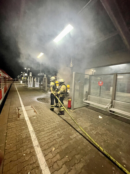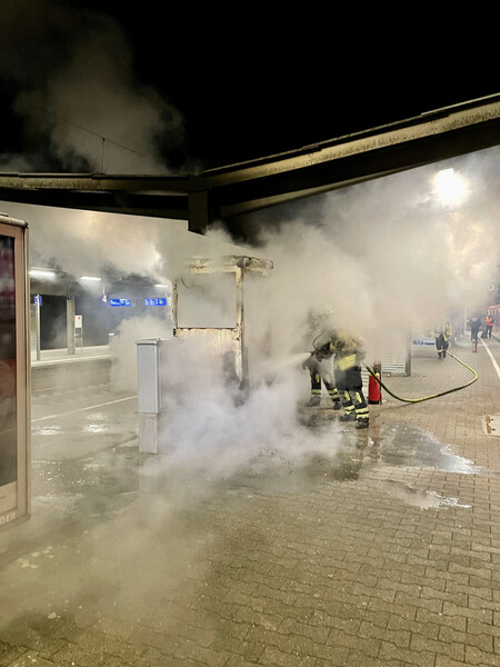 Wir löschten das brennende Zugführerwartehäuschen mit einem Rohr und einem Trupp unter Atemschutz. Nach abschließender Kontrolle mit der Wärmebildkamera übergaben wir die Einsatzstelle der Bundespolizei.