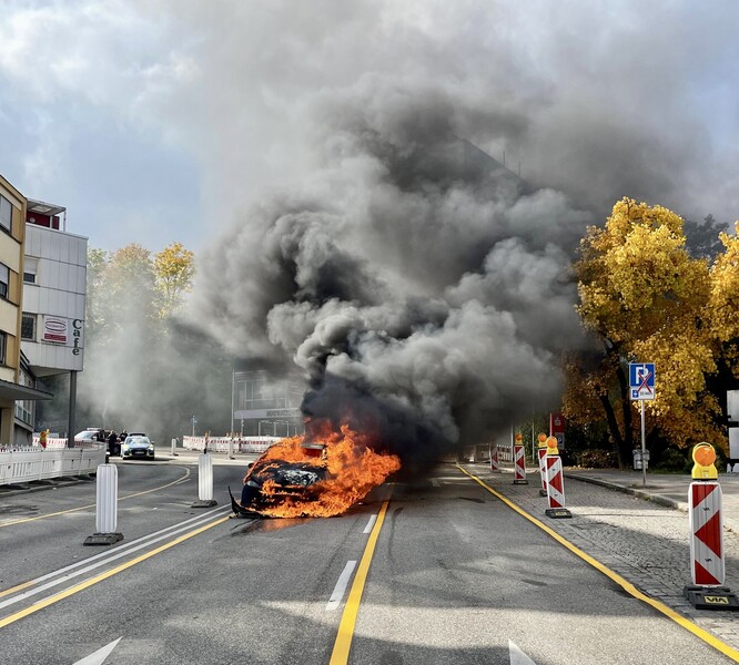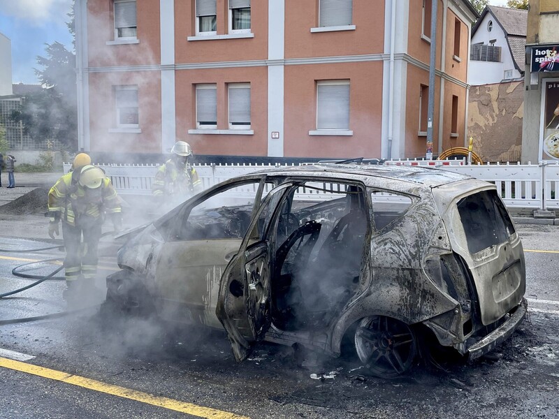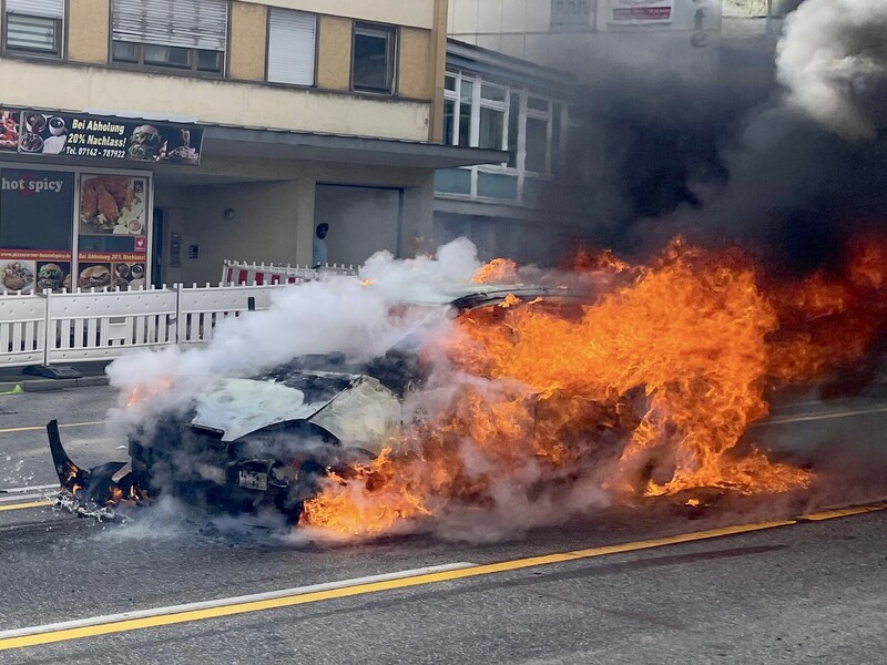 Um kurz vor halb eins wurde uns in der Stuttgarter Straße auf Höhe der dortigen Kreissparkasse ein brennender Pkw gemeldet. Die gemeldete Lage deutet sich bereits auf der Anfahrt, aufgrund einer massiven Rauchentwicklung, an. Vor Ort angekommen stand der Pkw bereits in Vollbrand. Ein Trupp unter Atemschutz löschte mittels Schnellangriff Wasser das brennende Fahrzeug. Mit Hilfe eines Baggers, von der Baustelle nebenan, wurde das ausgebrannte Fahrzeug aus der Fahrspur geschoben. Im Anschluß reinigten wir groß die Fahrbahn. Mit der Beseitigung des restlichen Öls wurde eine Fachfirma von der Polizei beauftragt. Nach Abschluß aller Maßnahmen übergaben wir die Einsatzstelle an die Polizei.