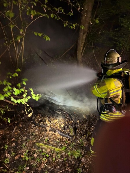 Die Feuerwehr wurde zu einem Vegetationsbrand in die Grünwiesenstraße alarmiert. Dort brannte auf Höhe einer alten Bunkeranlage Gehölz und abgelegte Äste.