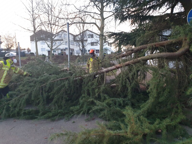 Die Feuerwehr wurde zu einem abgeknickten Baum in das Wohngebiet Buch alarmiert. Eine Tanne blockierte dort den Gehweg. Die Einsatzkräfte beseitigten das Hindernis.