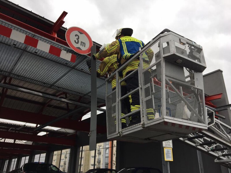 Aufgrund des Sturms war die Höhenbegrenzung an einem Parkhaus in der Lise-Meitner-Straße lose und drohte abzustürzen. Die Einsatzkräfte der Abteilung Bietigheim demontierten das Schild mittels Drehleiter.